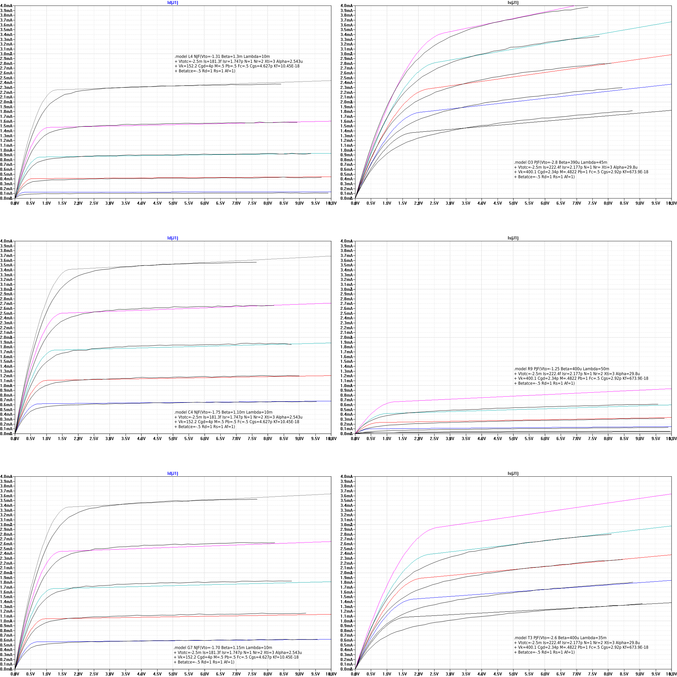 For a specific headphone amp I needed some complementary matched input JFETs, so I ordered a bunch of N and P FETs and ran them through a component tester. The results were rather disappointing: The PFETs had a transconductance in the range of 1.8-2.3mA/V, while the NFETs were in the range of 3.4-4.2mA/V. No matches that would come even close to perfect :(. The component tester spit out some more values like Vgs(off) and Drain Current at a specific Vds, which yielded some matches. But what would be the best match for my input stage? Eventually I decided to pick some of the FETs, trace some curves and then try to resemble them as good as possible in spice.