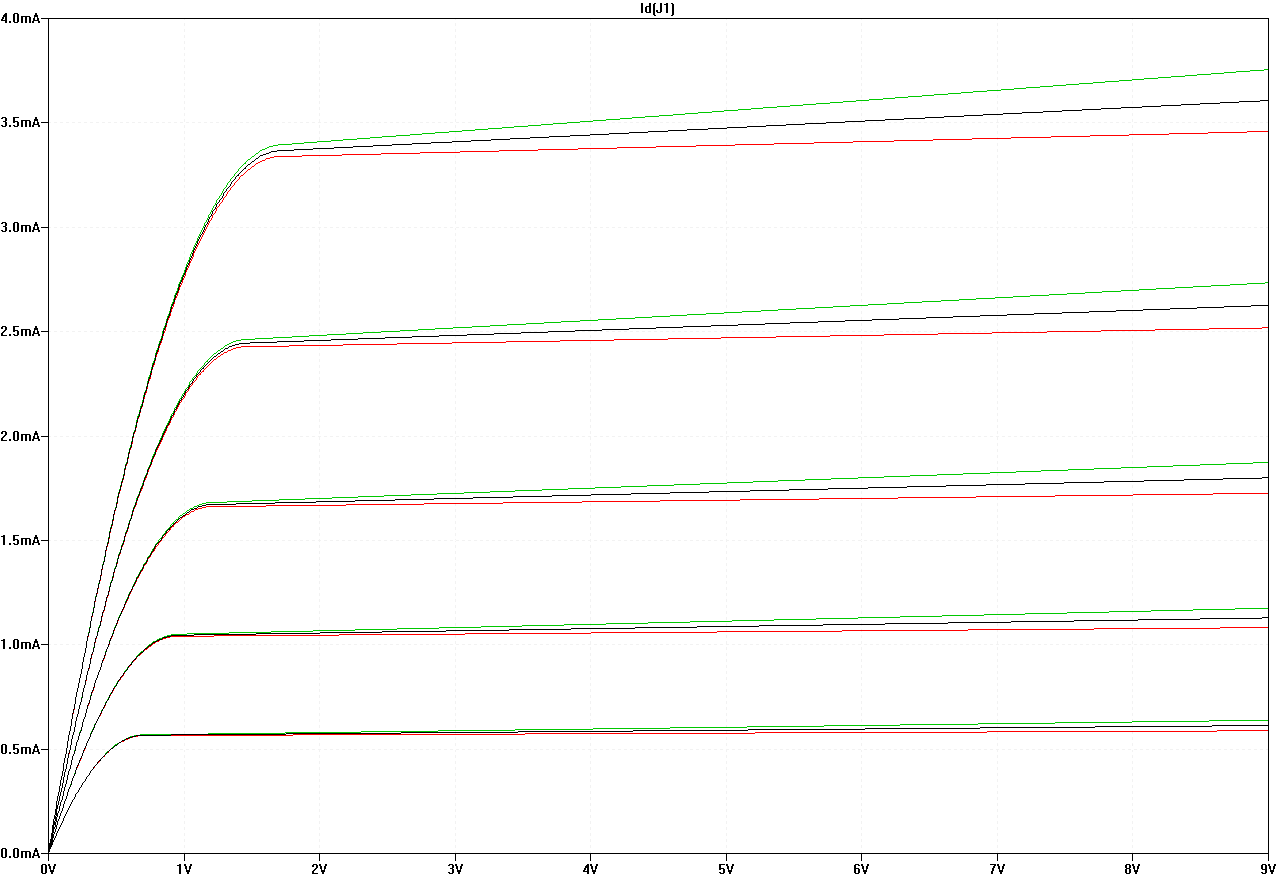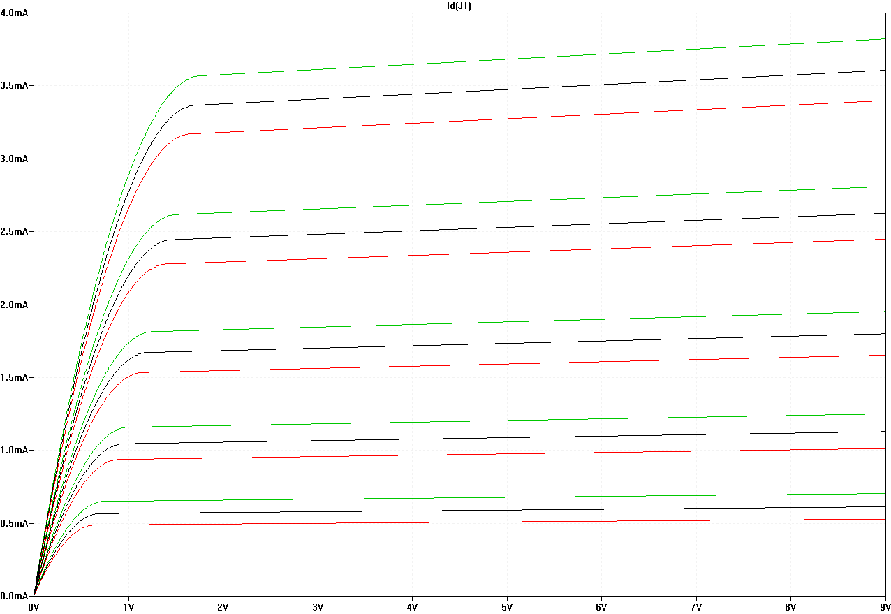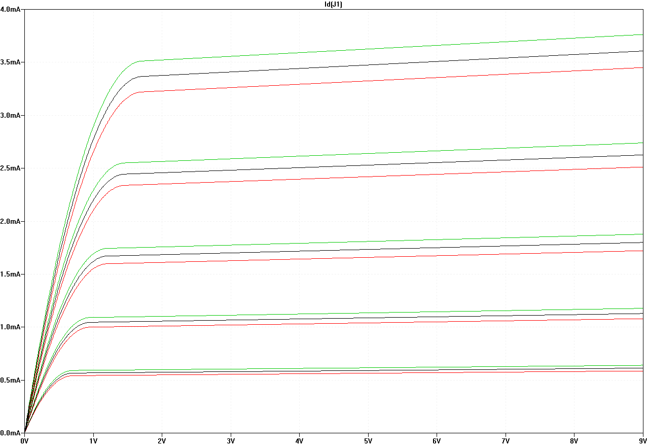 This are the curves for a single 2N5457 that were acquired using a Peak Electronics Atlas DCA75 and then plotted using LTspice for a uniform presentation of the graphs and easy comparison. It shows the Drain current over a Drain-to-Source voltage of 0V to 9V. The single traces resemble the Gate-to-Source voltage from 0V to -1V (top 0V, bottom -1V) in steps of -0.25V. The corresponding model for the 2N5457, courtesy of the internet, looks like this:
