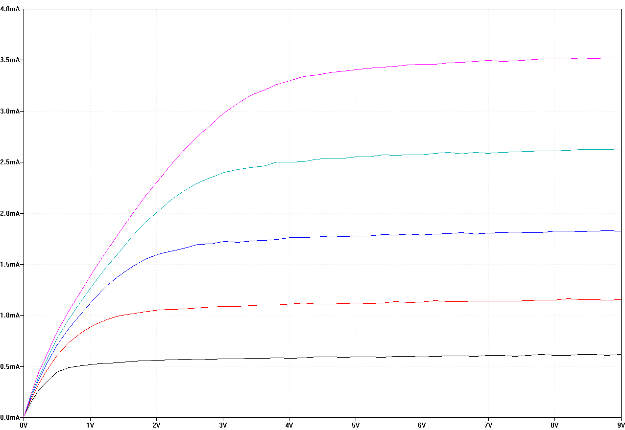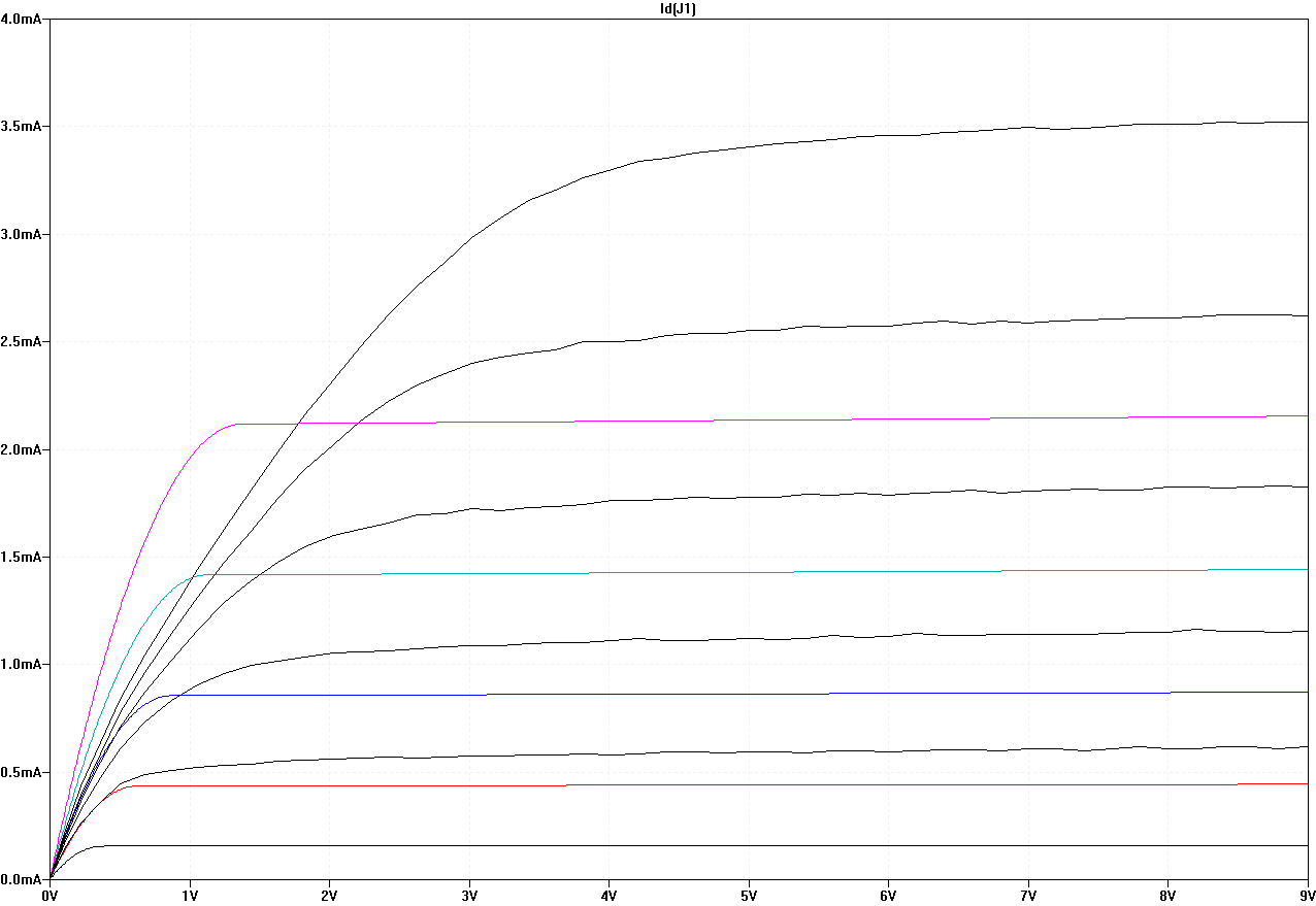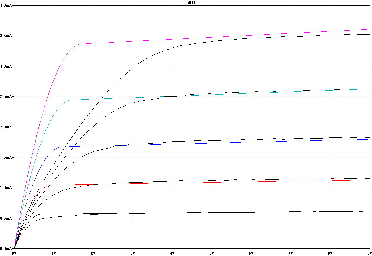 This are the curves for a single 2N5457 that were acquired using a Peak Electronics Atlas DCA75 and then plotted using LTspice for a uniform presentation of the graphs and easy comparison. It shows the Drain current over a Drain-to-Source voltage of 0V to 9V. The single traces resemble the Gate-to-Source voltage from 0V to -1V (top 0V, bottom -1V) in steps of -0.25V. The corresponding model for the 2N5457, courtesy of the internet, looks like this: