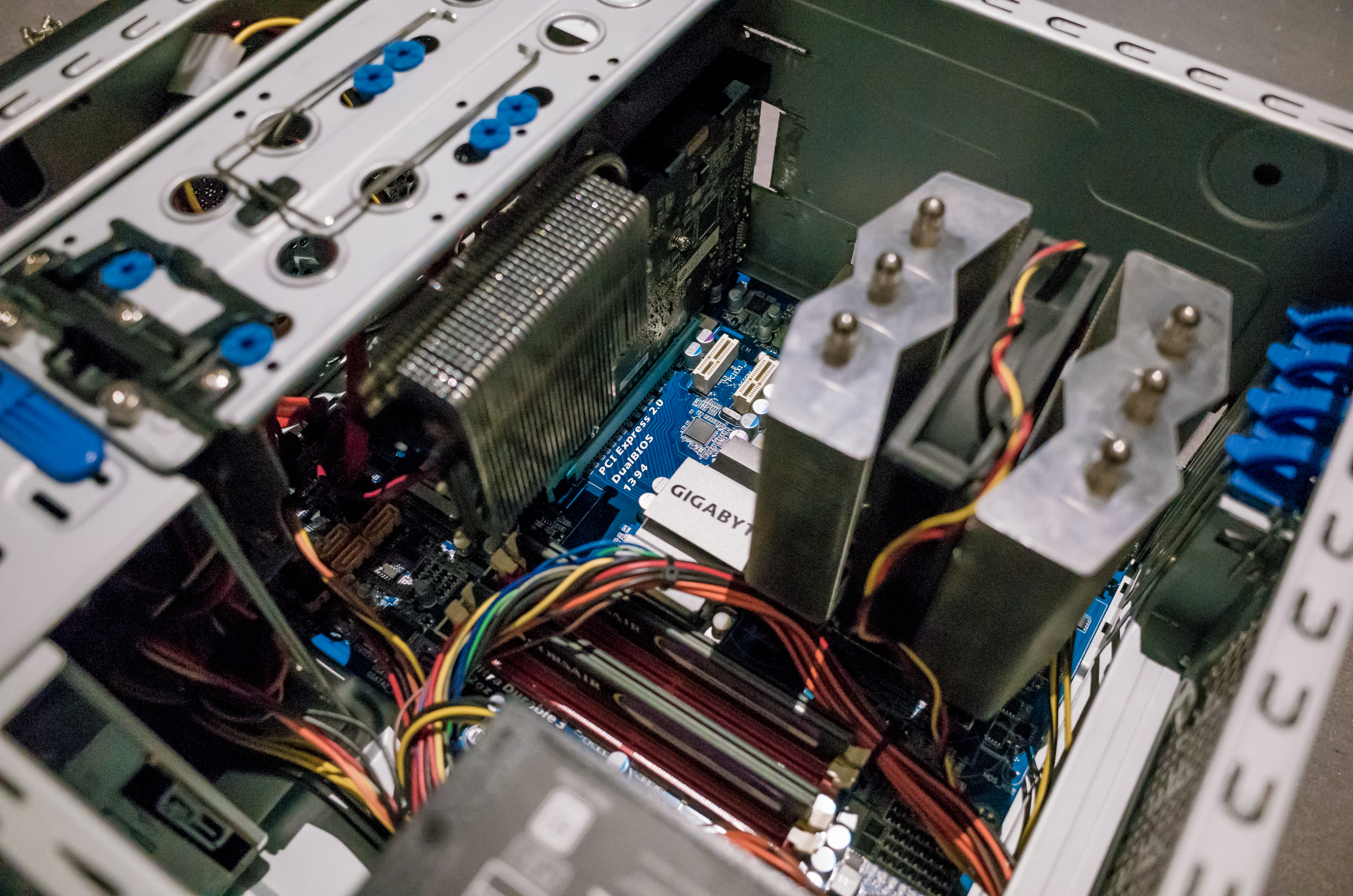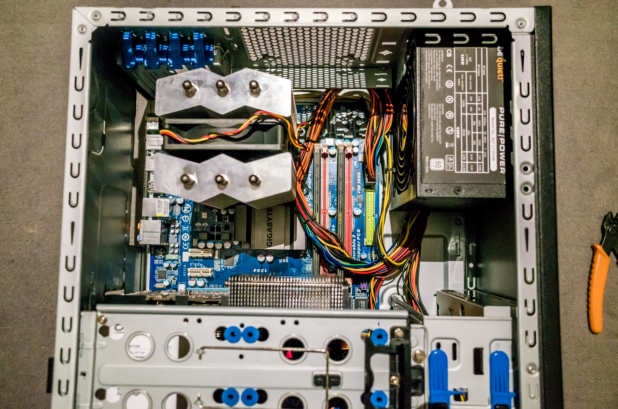 This week I've been playing with the thought of building myself a little headless system for some number crunching or server duty. I've looked around my collected computer garbage and happened to have all the necessary parts at hand: case, power supply, board with RAM, CPU plus cooler, SSD, even a passive cooled PCI-E graphics card for the initial setup. Everything fine so far, were it not for a little 'mismatch'. The mainboard was a Gigabyte GA-EP45-UD3 in full ATX form factor, but the case was only able to house smaller boards of the Mini or Micro-ATX form factor.