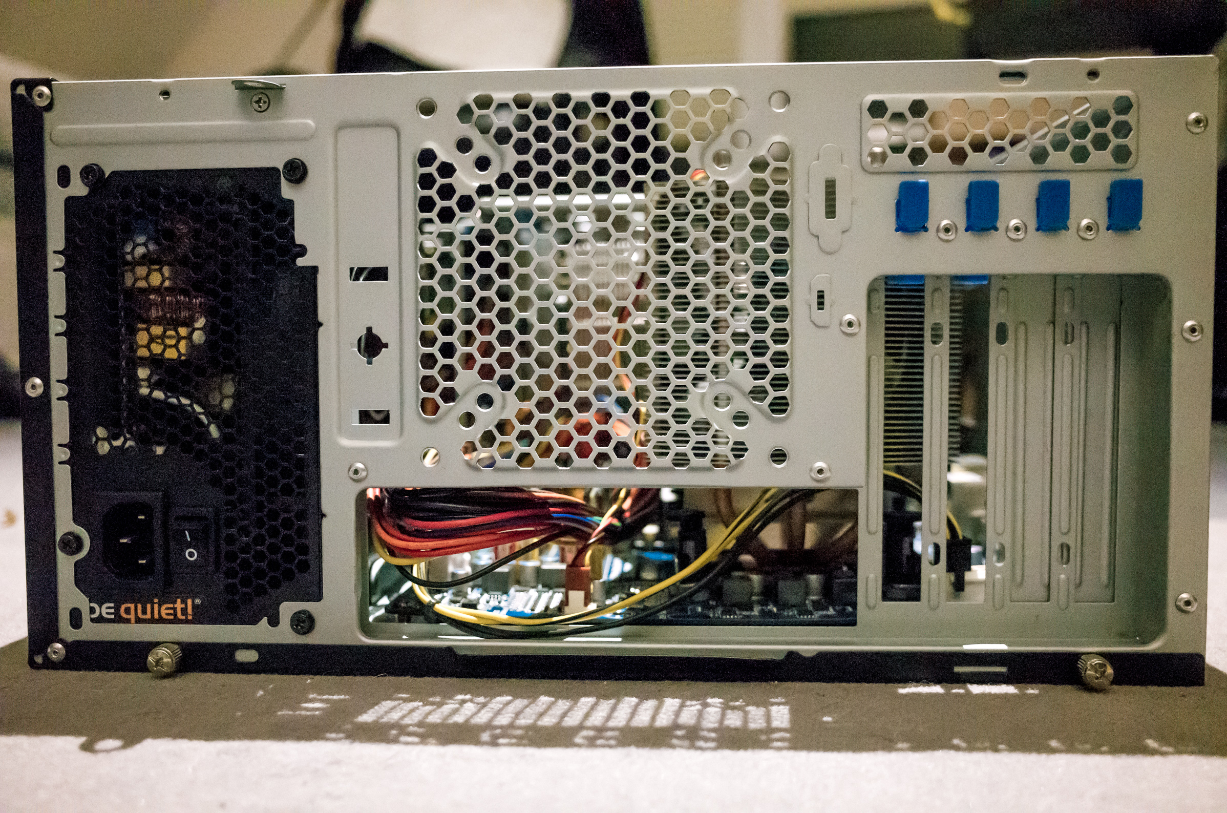The first idea was to remove the PSU and move the board up to the top of the case. That would have retained the original alignment together with the functionality of the slots at the back, but re-fitting the PSU afterwards seemed to be quite a pain in the ass and I'd have to cut away parts of the 5,25″ cage for the optical drives. The other idea was to leave everything in place as it is and simply rotate the board. That way it fit in there nicely and I just had to make some additional holes on the underside of the case to regain access to the connectors. I could even re-use one of the threaded holes for the mounting studs! Of course there's nothing to screw the PCI cards to now, but since the graphics card is only needed for initial setup and everything else is on-board, this is no problem for me.