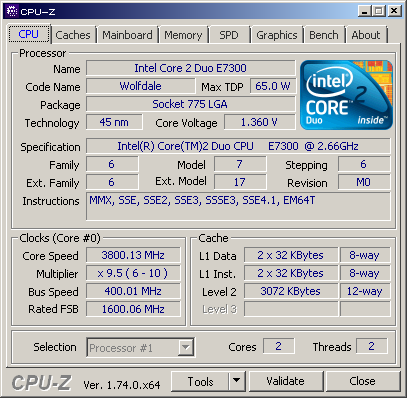Now the mini tower is converted to a desktop case, as long as it is not standing upside down (from the original upside). While I was at it, I set up the system with a fresh install of Windows 7 and then went for some overclocking. Pushing the FSB from 266MHz up to 400MHz was easy, but Prime95 wasn't stable for long. Even with a Vcore of 1.360V (set to 1.3965V in BIOS), which is close to the recommended maximum of 1.3625V, the system was not stable running at 4GHz. Absolute maximum voltage is 1.45V, but I didn't want to push it further. I backed up just a little and set the multiplier from 10x to 9.5x, so I'm left with 3.8GHz running stable (TM) now, which is a whopping 42% increase over the stock 2.66GHz of this rather low-power Core2Duo E7300. Delta-T is almost 20 degrees Celsius, Prime95 is running and I'm happy :) !