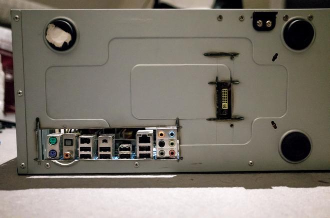 Not wanting to wait for a new case (and not wanting to shell out any money for a new case...), there was only one thing to be done: get out the angle grinder and cut the board to fit! Who needs those old PCI slots, anyway? Well, I rather cut some new openings in the case and re-aligned the board to make it fit.