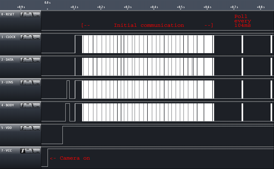 Five years after I first prepared an Olympus lens with connections to capture the camera to lens communication, I finally managed do obtain (well, buy) a logic analyzer to actually do this. Might be a little late already, though, since Four Thirds seems to be abandoned - or at least it's getting replaced by the new Standard ''Micro Four Thirds''.