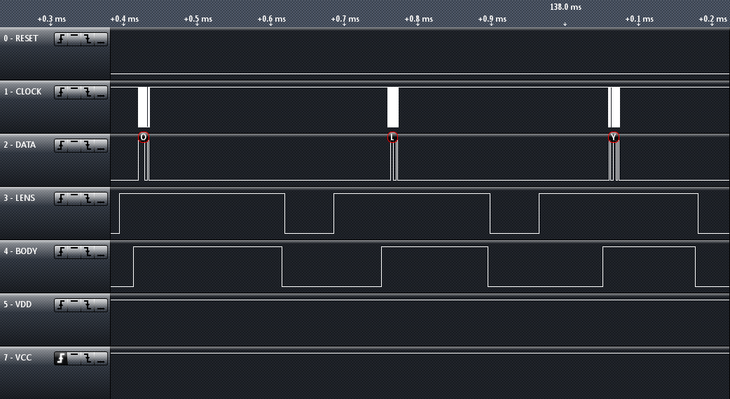 Note that on the second picture it is apparent that the lens is trying to send the characters in a fixed interval, while the body takes different times to acknowledge and start the transmission.