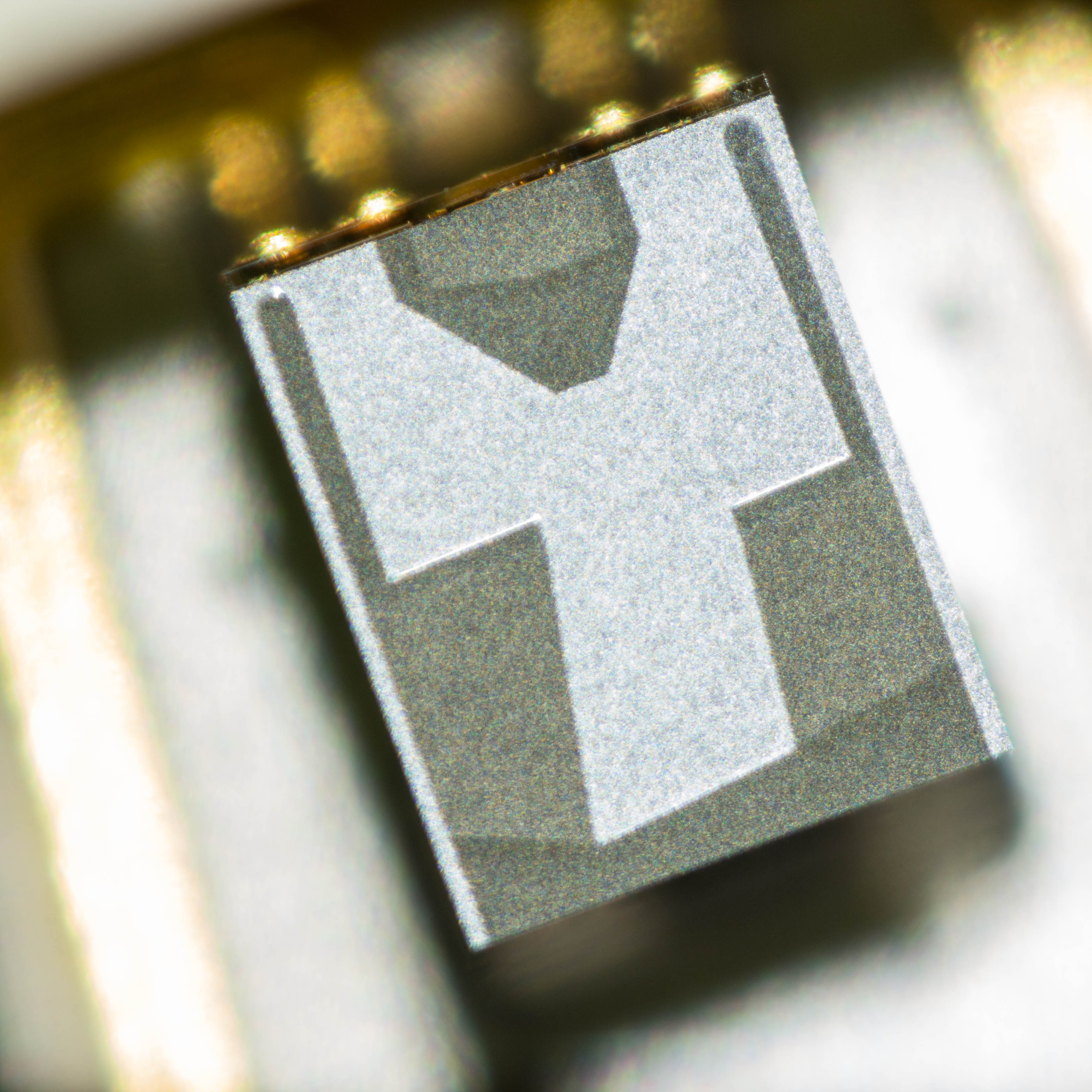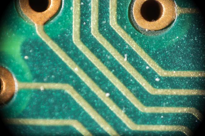 Leiterplatte. Die Leiterbahnen sind vermutlich 4mil (0.1016mm) breit und 6mil (0.1524mm) auseinander. Die Kupferschicht wird 35µm dick sein, der Stopplack offenbar noch etwas mehr.