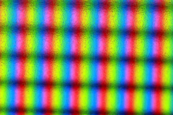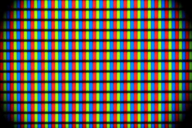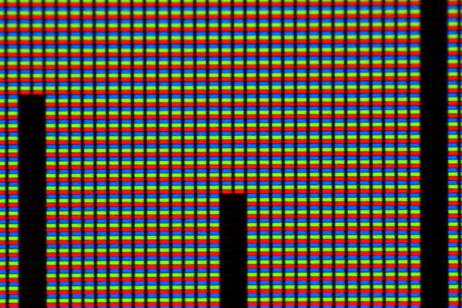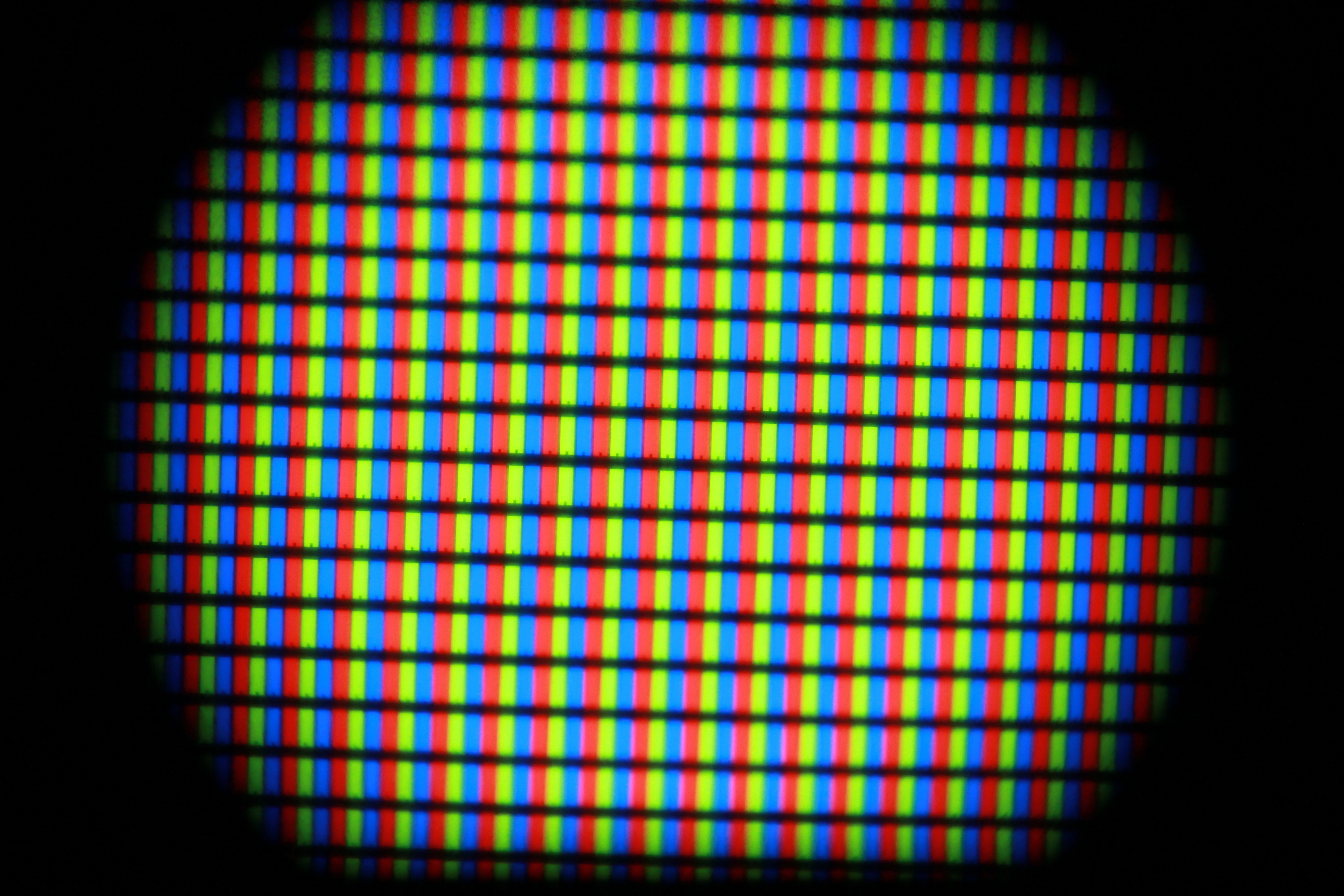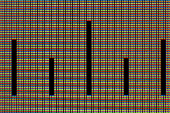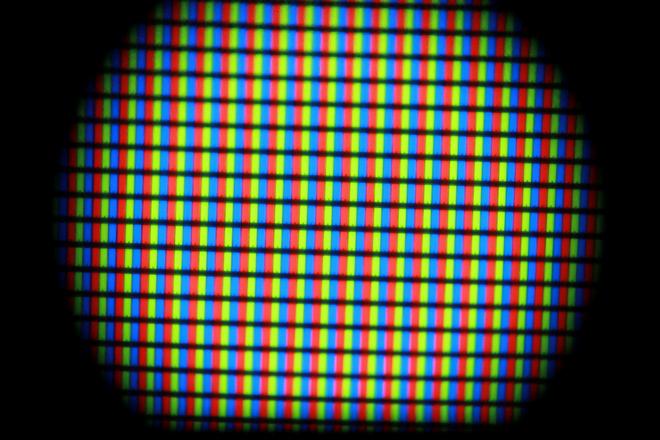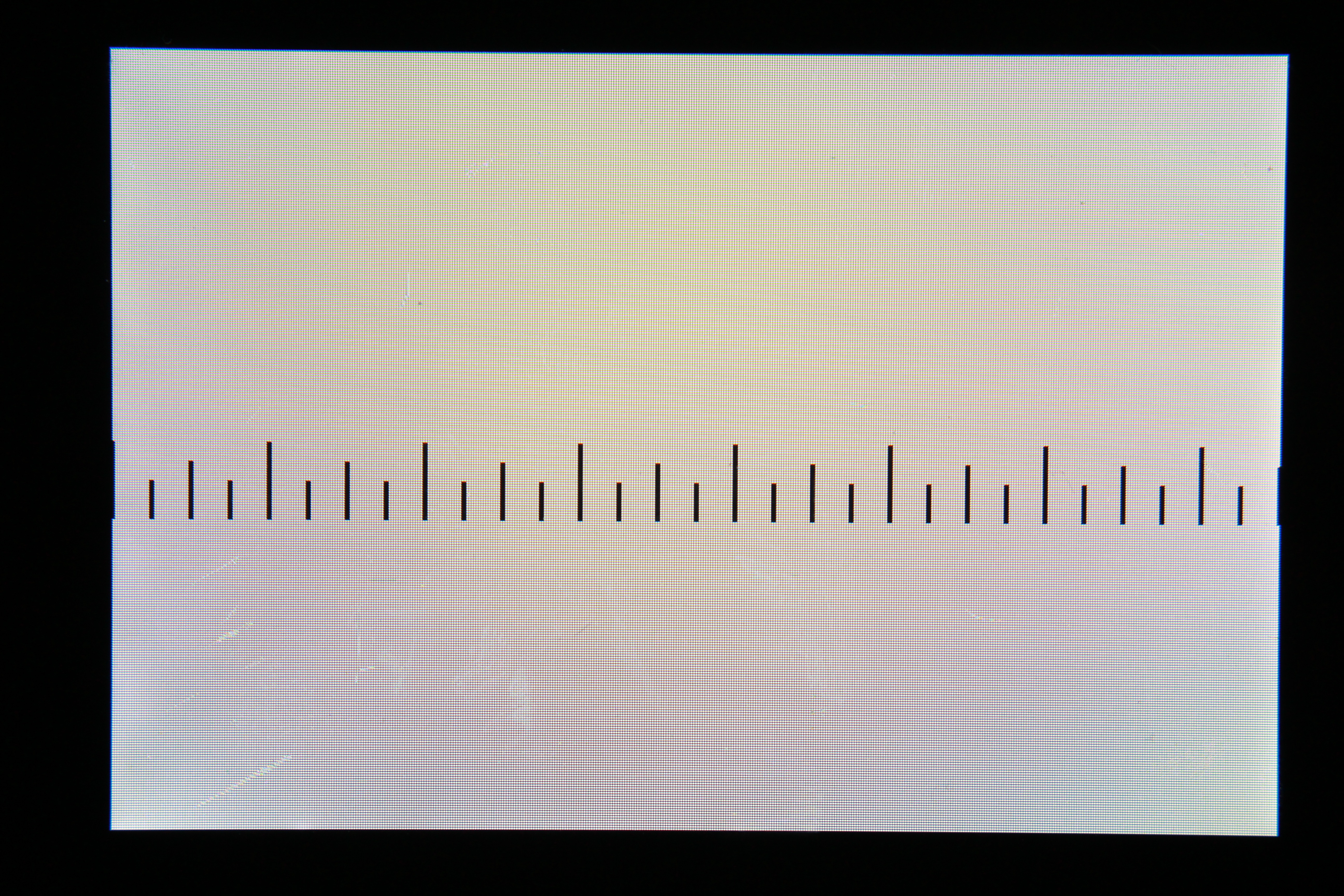 Als Testobjekt diente mir hier ein iPod Touch 3G, dessen Display ziemlich genau 7,5cm breit ist und 64 Pixel pro Zentimeter hat. Zur besseren Orientierung habe ich ein exaktes Displaylineal gebastelt; auf dem letzten Bild sieht man also gut einen halben Zentimeter. Die Bilder sind jeweils in voller Auflösung verfügbar, falls jemand die Qualität beurteilen möchte. Eine kleine Anmerkung dazu: Die Schärfentiefe ist bei f/5.6 noch so groß, dass die Unebenheiten des Deckglases sich hier noch negativ auswirken. In ebendiesem Glas sind nämlich erstaunlich viele Bläschen, die es weiter unten noch genauer zu sehen gibt.