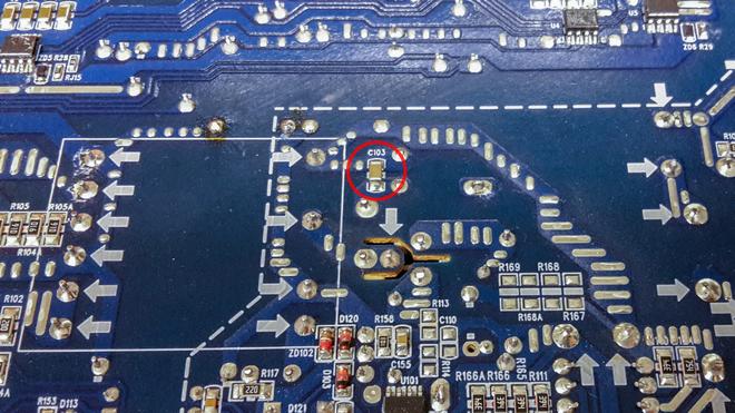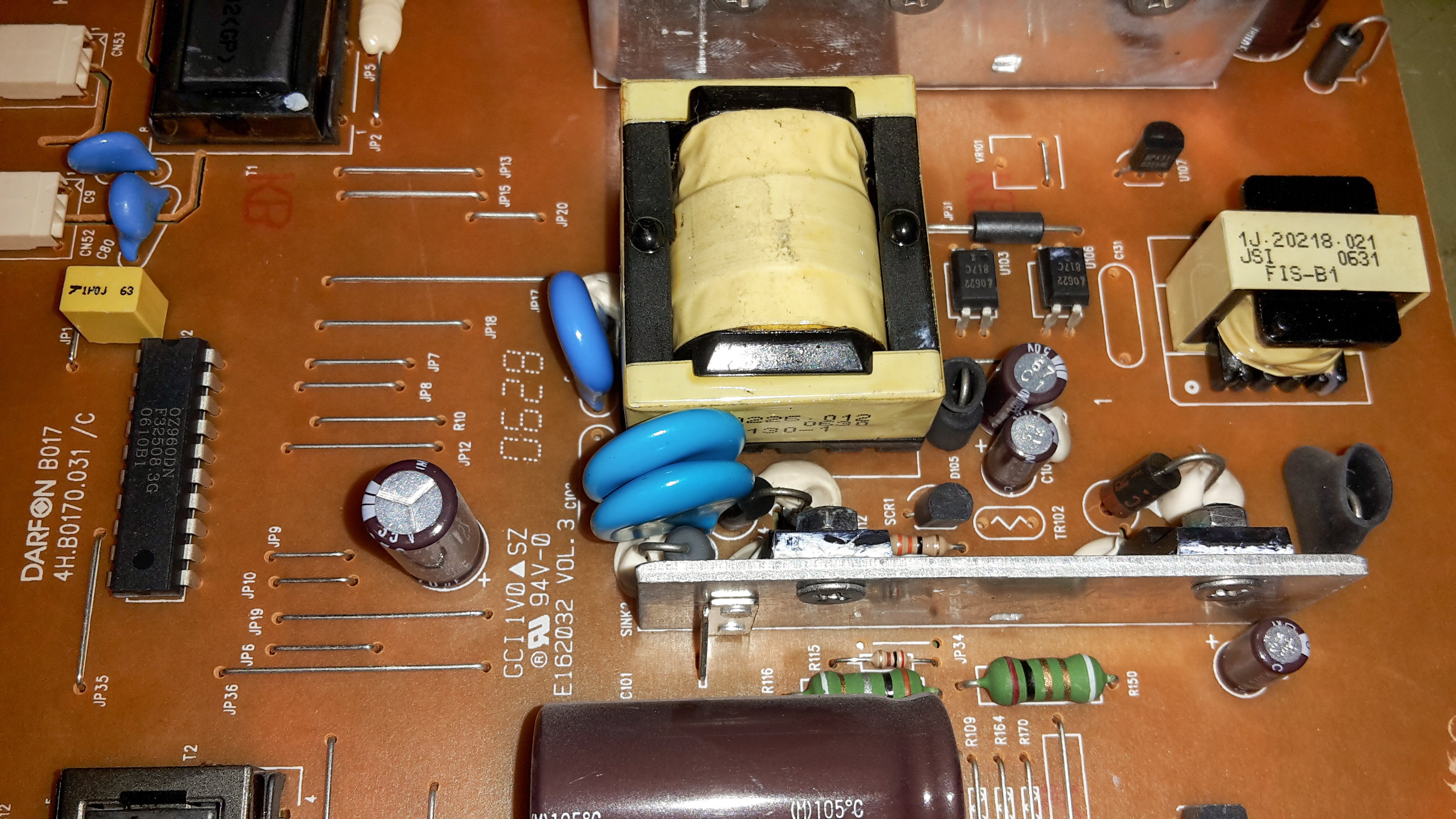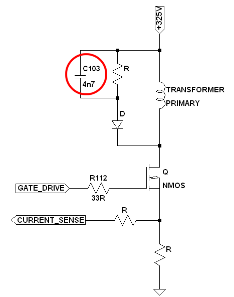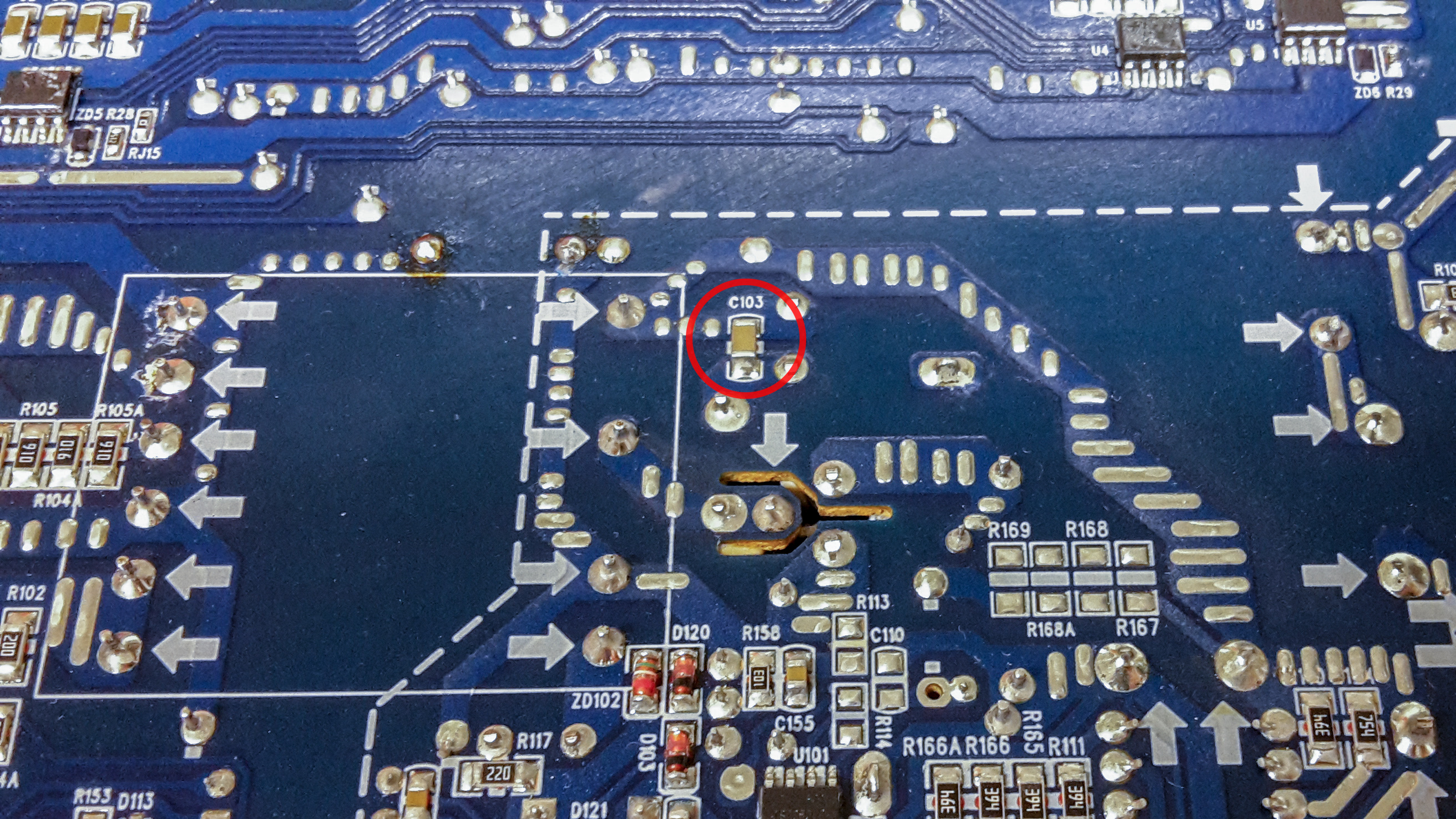 Da das Fiepen im Standby am lautesten war, habe ich mir erstmal die Primärseite des Netzteils angesehen. Wenn das nicht viel leisten muß, verfällt es gerne in einen Taktbetrieb. Das passt ziemlich gut zu den Geräuschen. In dem Bereich sind nicht so furchtbar viele Kondensatoren, daher war der erste Kandidat schnell gefunden: C103, der Snubber-Kondensator parallel zur Primärwicklung. Ein kurzer Test im ausgebauten Zustand ergab eine Kapazität von ca. 4,7nF. Da ich keinen passenden Kondensator mit diesem Wert und entsprechend hoher Spannungsfestigkeit zur Hand hatte, mussten es zwei 3kV-Scheibenkondensatoren mit jeweils 2.2nF parallel eben tun. Und siehe da: Stille! :) Mit einem vorhandenen, nicht benutzten Loch und einem weiteren selbstgebohrten Loch konnten die Beiden dann auch recht unauffällig auf die Platinenoberseite wandern und dort ihren Dienst verrichten.